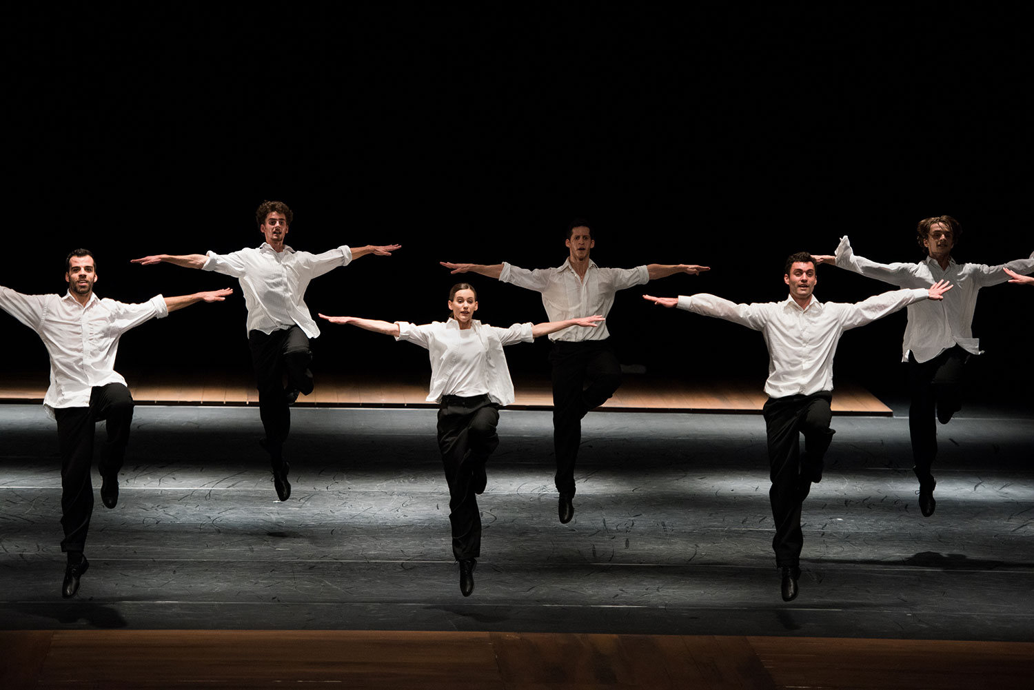 La soirée s’est clôturée sur la pièce Die Grosse Fuge, par Anne Teresa de Keersmaeker sur la partition éponyme de Ludwig van Beethoven. Créée en 1992, la partition de danse s’impose aujourd’hui comme un classique de la danse contemporaine, explorant entre autres le motif de la chute. Si l’ambition ici peut être de donner à voir la musique, les corps des huit danseurs épousent et explorent en effet ces rythmes répétitifs, entêtants, insistants, donnant toute leur valeur aux intervalles et aux silences. S’enchaînent les face à face, les confrontations, les mouvements de groupe et chaque danseur et danseuse est vêtu(e) du même costume de ville, noir et blanc, sobre, souple et rigide à la fois. Ces couleurs et ces lignes dessinent un tableau en constante mutation, et l’agilité de l’interprétation, vive et précise, nous ferait presque croire à une improvisation de groupe, emportée dans et vers un même élan, une même quête. Les systèmes de boucles et de ruptures font de ces quinze minutes de partition un moment hypnotisant, visuel, sonore et sensible. Cette musique qui n’a pas été écrite pour la danse nous apparaît ici indissociable du corps de ballet.