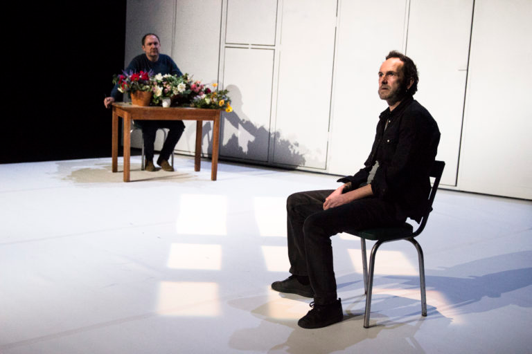 Quand toute la ville est sur le trottoir d’en face n’est pas un spectacle sur la toxicomanie, il nous parle plutôt depuis la toxicomanie, et plus précisément depuis le moment de la désintoxication. Le décor, épuré, est celui de la clinique : un mur blanc coulissant qui module l’espace, une table, deux chaises. Deux personnages y cohabitent : le toxicomane et son soignant.
