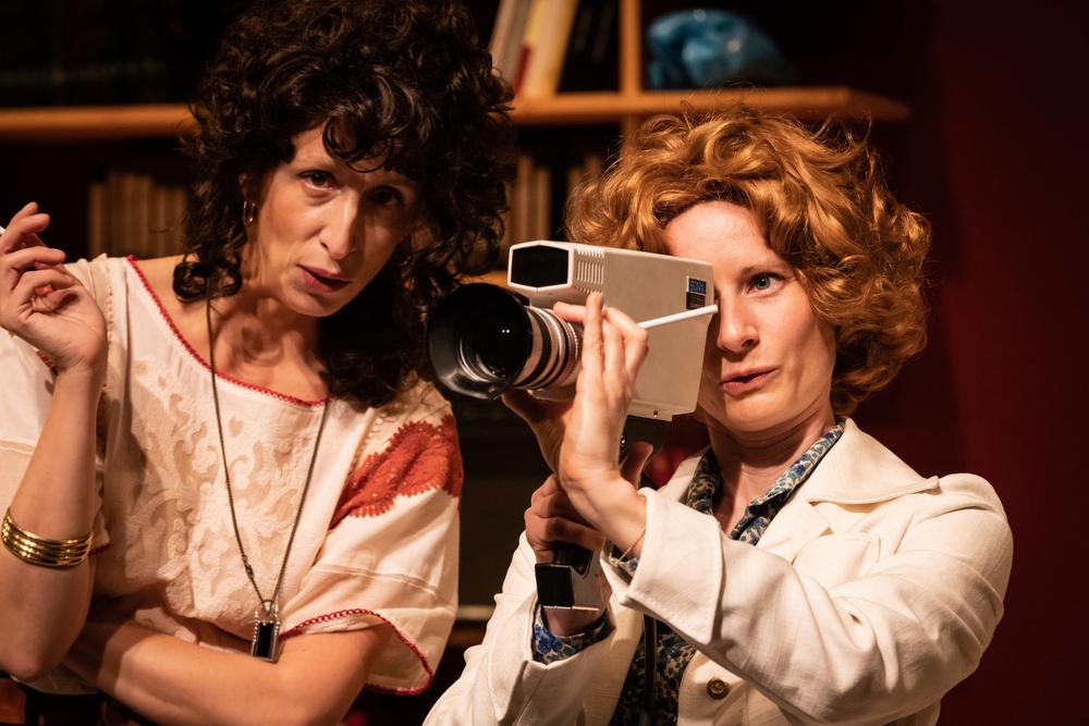 Au plateau, dans un intérieur vintage avec moquette, bibliothèque fournie et instruments d’enregistrement et de diffusion en tout genre, une femme. Sa chevelure brune et son enthousiasme communicatif ne trompent pas : il s’agit de Carole Roussopoulos, réalisatrice suisse et militante féministe. Elle invite le public à un stage de prise en main du Portapak, la première caméra portable sortie en France en 1967 dont elle a fait l’acquisition deux semaines après que Jean-Luc Godard a acheté le premier exemplaire. C’est ainsi, dans un stage de réalisation, qu’elle va rencontrer Delphine Seyrig, comédienne et future réalisatrice. Adoptant la coiffure des deux femmes, à l’aide de perruques aux boucles fournies, les comédiennes de Delphine et Carole, inspirées par le documentaire Delphine et Carole, insoumuses [1], empruntent également leur voix, recréant les discussions et les événements ayant marqué leur travail commun.