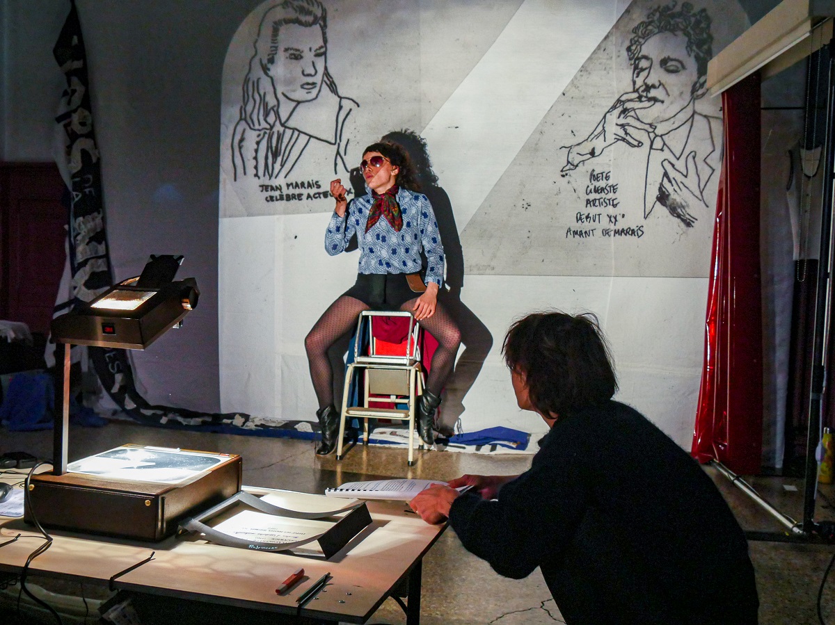 Ce qui convainc d’emblée, c’est d’abord la reproduction des gestes militants, par le retour concret sur la pratique filmique des insoumuses. Dans Delphine et Carole, de nombreux objets présents sur scène renvoient à la manipulation des enregistrements : petit atelier de montage sur bandes sonores, moniteurs de montage, radio, etc. De son côté, Rembobiner, en utilisant un rétroprojecteur en guise de caméra, parvient à recréer en direct les techniques de montage et de collage qui étaient effectuées sur la pellicule [3]. Le bricolage est au service de la reproduction d’une pratique tant militante que pédagogique. La stratégie des insoumises d’hier rejoint celle des créatrices et metteuses en scène d’aujourd’hui – mener de front la mise en lumière des vies extraordinaires du quotidien [4] et le détournement d’une parole patriarcale hégémonique.