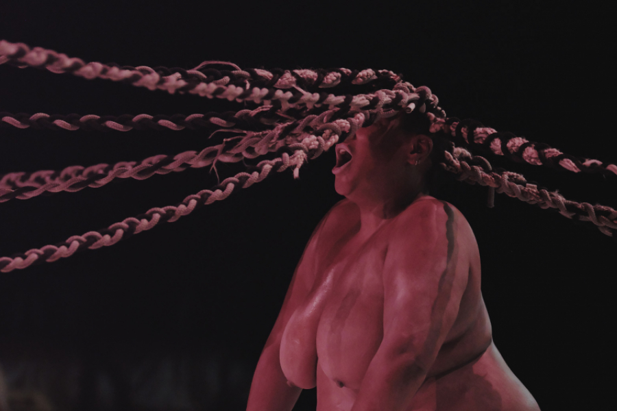 Sans doute est-ce aussi parce que le spectacle n’est pas seulement adressé au public. C’est ce que nous rappelle la dernière partie qui apparaît comme un ultime retour sur soi autour de la figure d’une femme-arbre (Rébecca Chaillon) dont les longues nattes ont été formées par des mains adroites et complices au début de la pièce. De performeuse un peu limitée dans ses gestes par sa propre chevelure, si lourde qu’elle est obligée de la poser sur une sorte de pied à perfusion pour se déplacer, elle devient le symbole de cette relation entre ancrage et bourgeonnement. En même temps qu’elle est enracinée dans le sol de la scène, entourée et prolongée par ses sœurs, filles et amies, ses branches et ses feuilles se déploient bien plus loin pour accueillir d’autres corps et d’autres luttes. Ce spectacle nous est adressé oui, mais pas seulement, il est pour elles et pour des publics souvent rares auxquels certains spectacles choisissent de ménager des espaces.