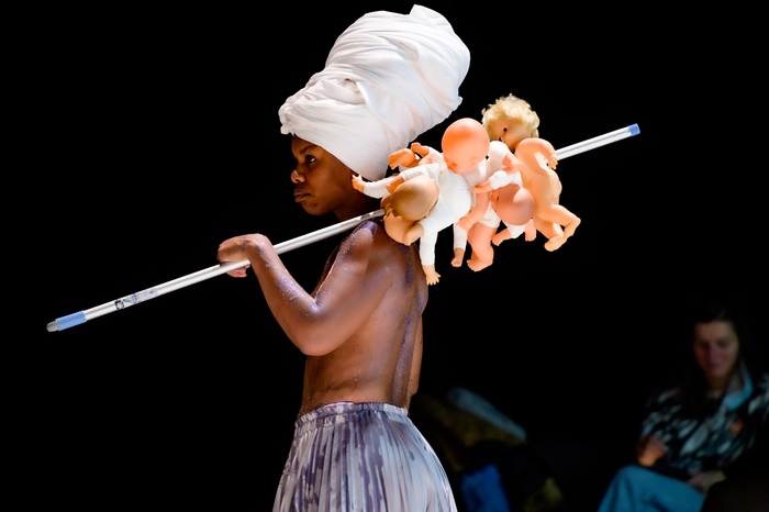 Sur scène, huit performeuses afrodescendantes vont exposer les réalités de leurs expériences diverses avec humour et ironie pendant les 2h40 de spectacle. Les corps des différentes artistes aux talents multiples (chant, acrobatie, musique, poterie) s’emparent de la scène mais s’en défont aussi avec une virtuose agilité. Difficile de définir ce qui se déroule sous nos yeux tant l’énergie est vive et les strates de discours multiples. C’est avec une redoutable efficacité et une approche plurielle qu’elles représentent et questionnent les stéréotypes et les discriminations systémiques que subissent les femmes noires et métisses. La pesanteur de l’atmosphère, des mots et des sujets est sans cesse en balance avec la légèreté comique qui rythme le spectacle.