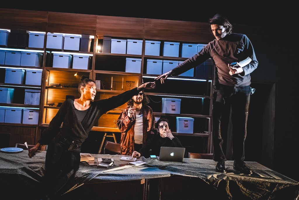 Ainsi la pièce est une imbrication de scènes où la parole prend beaucoup de place, et où un dialogue peut par exemple amener les protagonistes à « s’extraire » de la trame narrative de base pour s’exprimer face au public, en direct avec nous. La distance avec le public est complètement cassée et revisitée, on passe de moments très drôles où on se sent proches des personnages à des scènes qui reviennent aux sources des textes de Kertész. Le dispositif scénique est ingénieux. Des bureaux se déplacent sur des rails et, selon leur position, ils peuvent être mis bout à bout pour créer une grande table, un bar, une estrade ; séparés ils deviennent des pièces, un studio, un lit…