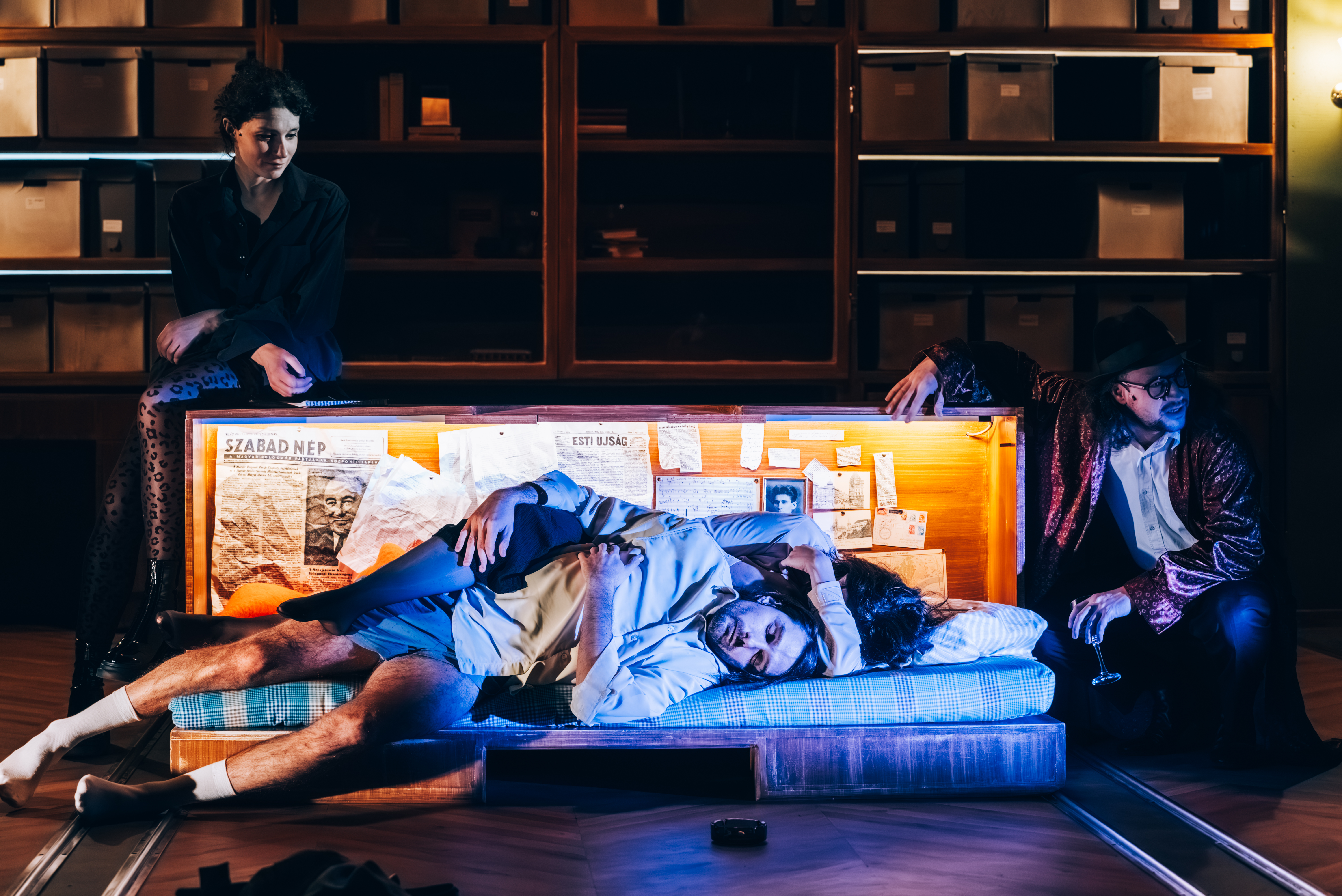 Ainsi la pièce est une imbrication de scènes où la parole prend beaucoup de place, et où un dialogue peut par exemple amener les protagonistes à « s’extraire » de la trame narrative de base pour s’exprimer face au public, en direct avec nous. La distance avec le public est complètement cassée et revisitée, on passe de moments très drôles où on se sent proches des personnages à des scènes qui reviennent aux sources des textes de Kertész. Le dispositif scénique est ingénieux. Des bureaux se déplacent sur des rails et, selon leur position, ils peuvent être mis bout à bout pour créer une grande table, un bar, une estrade ; séparés ils deviennent des pièces, un studio, un lit…
